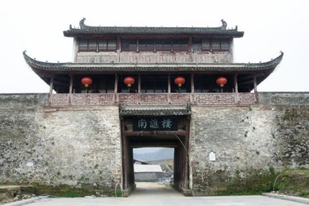 南譙樓,始建于隋末,為歙州(今徽州)人汪華吳王府外子城的正門門樓。南譙樓是古代夜間向人們報時的地方,打更的鼓聲就是從譙樓傳向四面八方的。南譙樓三重三開間,高約20米,寬約15米,進深約10米。磚木結(jié)構(gòu),懸山頂,重檐高脊,紫墻青瓦。下為門厥,門闕寬4.5米,左右各有木柱13根。每根柱圍1米余,每柱均呈10度左右斜倚墻壁,用以支撐大梁。1997年,國家文物局撥款重建,并基本保持了木構(gòu)清代風(fēng)格,門闕為宋代風(fēng)格。