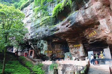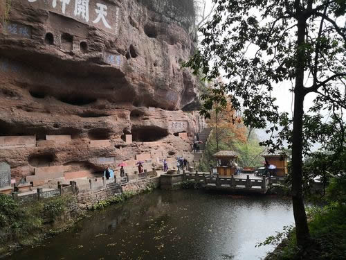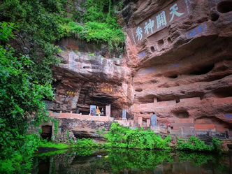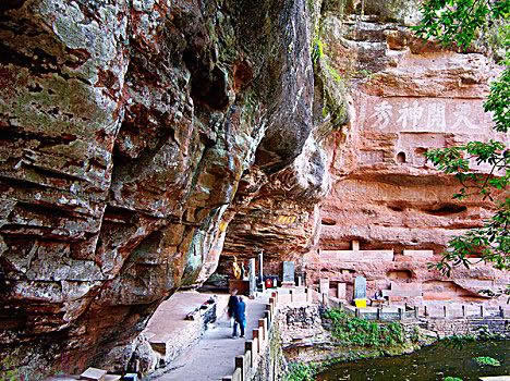 真仙洞府:過天門巖,下石階即達(dá)。這里危崖三彎折,相連如城垣。巖下通道沿砌石欄桿,欄外為碧蓮池,共構(gòu)一“叵”字形;崖間洞窟累累,依次有八仙洞、觀音洞、真仙洞(羅漢洞)、雨君洞、文昌洞、白馬洞、珠簾洞,就洞建宮宇,祀道教各路神仙,統(tǒng)稱真仙洞府。崖壁、摩崖題字石刻,如“天開神秀”、“齊云勝景”等多達(dá)近百處。