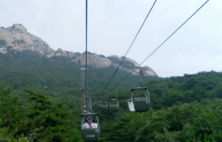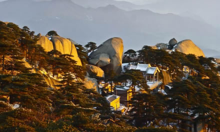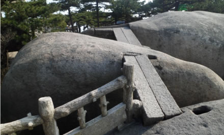 天池峰,為天柱山的第二高峰,它稍高于飛來峰,海拔1426米。天池峰,一裂為三,由兩段石條連接在一起,稱為“渡仙橋”,登上天池峰頂,可觀日出、云海、佛光、晚霞景觀?邕^渡仙橋,即達(dá)方圓不足10平方米的一平臺(tái),臺(tái)中大小兩個(gè)石坑,稱“天池”。天池平臺(tái)外沿是懸崖絕壁,稱試心崖。試心崖可觀賞“天柱山佛光”景觀。