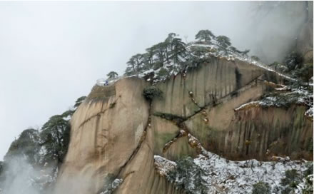 天池峰側(cè)畔的懸崖之間,屹立著一株高大的松樹。這棵天柱松長(zhǎng)在千米高的石壁上,石壁面向天柱峰與飛來峰,天柱松依山崖而長(zhǎng),松高不過5米,粗不過80公分,可據(jù)勘測(cè)它有1500多年的歷史。