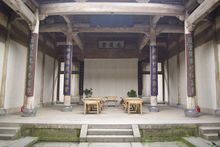 前廳是整幢房子中最精華的部分,大門后面聳立著一幅威儀的中門,在中門“!弊值纳戏,鑲有一幅木雕“百子鬧元宵”圖,圖上雕刻著100個小男孩過元宵鬧花燈時的情景,這正是古代“多子多!眰鹘y(tǒng)觀念的生動寫照,“百子鬧元宵”圖兩邊的“商”字斗拱上則分別雕有四出《三國演義》的戲文,斗拱的上方雕有“南、北”財神,“南、北”財神的上方是閣樓護板,在此,汪定貴設(shè)計了“漁、樵、耕、讀”四根木雕立柱,分別代表了古代的四種職業(yè)。