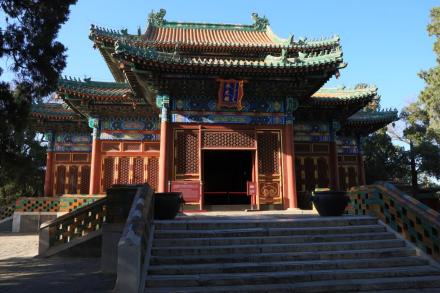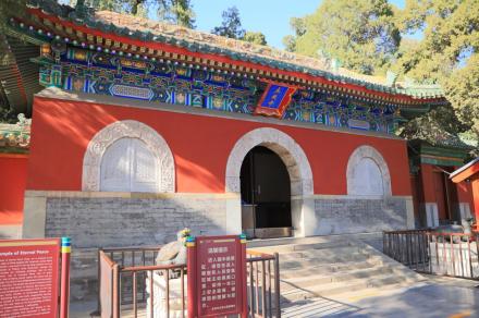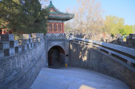 智珠殿,半月城位于瓊島東麓山腳下,座西面東與陟山橋相對,建于乾隆十六年(1751年)。智珠殿建在半月城城臺上,紅墻綠瓦,四面有五個牌樓相對,中軸對稱、布局別致是中國古建筑中比較少見的,殿內(nèi)原供奉文殊菩薩一尊。