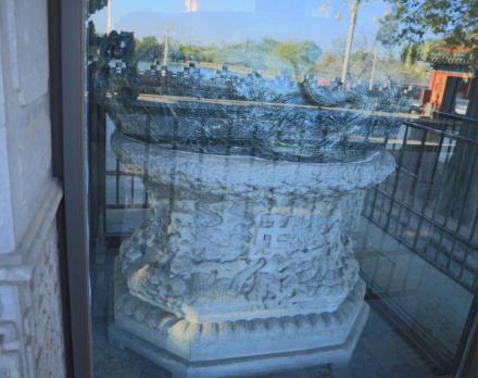 玉甕又稱“瀆山大玉!,制作于至元二年(1265年)?诔蕶E圓形,通高70公分,周長493公分,重約3500公斤,周身浮雕海龍、海馬、海豬、海犀等出沒于波濤之中,栩栩如生。元世祖忽必烈曾將玉甕放置瓊?cè)A島廣寒殿中,傳說曾用以盛酒大宴群臣。明代廣寒殿倒塌,玉甕失落民間。清乾隆十年(1745年)發(fā)現(xiàn)后,乾隆皇帝“令以千金易之,置承光殿中”,乾隆十四年(1749年)建玉甕亭,將玉甕陳設(shè)于亭中配以漢白玉雕花石座,命翰林四十人,各賦詩一首,刻于亭柱之上。