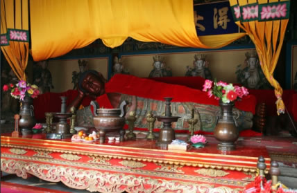 俗稱臥佛寺,位于海淀區(qū)香山壽安山南,始建于唐,清雍正十二年(1734年)大修后賜名“十方普覺寺”。全寺規(guī)模宏大,總體布局和建筑配置一定程度上保留了唐宋寺院的特點。臥佛殿內的銅質臥佛為元代遺存,長5.3米,高1.6米,重4噸,頭朝西面,面向南,鑄造精良,是中國現存最大的銅質臥佛,具有較高價值,也是科技史研究的重要實物資料。