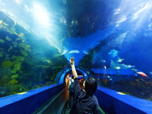 從南中國海下潛,經(jīng)過西太平洋、印度洋、紅海、地中海、到大西洋,海底隧道色彩斑斕的水中視覺效果,超大弧形亞克力膠展示窗掀開大海神秘的面紗。37個(gè)展缸向游客展示了地球上最具代表性海域的觀賞魚類。
