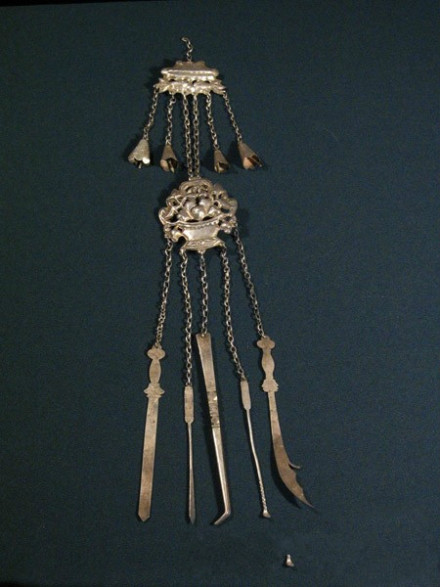 中華民族園收藏著上千枚中華各民族銀飾。大到鳳冠,銀衣、銀角、銀項(xiàng)圈,小如簪釵、戒指、耳環(huán)、銀扣琳瑯滿目,其中不乏明代、清代珍品。征集于北京、貴州、廣西、湖南、 山西、山東、陜西等地?缭綍r間有上千年之久。