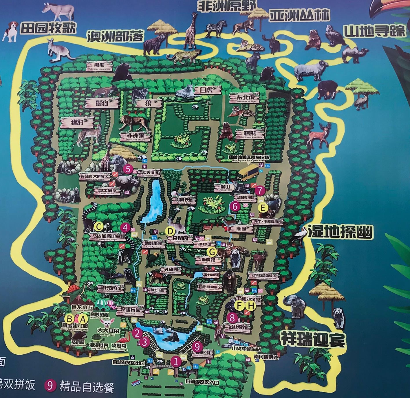 園區(qū)突出一個(gè)“野”字,體現(xiàn)一個(gè)“愛”字,以“保護(hù)動(dòng)物、保護(hù)森林”為宗旨,突出了“動(dòng)物與人、動(dòng)物與森林” 的回歸自然主題,渲染“人、動(dòng)物、森林”的氛圍,拉近人與動(dòng)物的距離。
