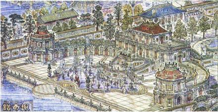 海岳開襟,是圓明園所有樓閣中最為豪華的一組建筑,海岳開襟建于圓明園中長(zhǎng)春園的西湖內(nèi),臺(tái)基為圓形,直徑近百米,上下兩層,漢白玉石憑欄圍繞。正樓為四出軒式的三層樓閣,下層為海岳開襟,南檐題“青瑤嶼”三字;中層為得金閣,題“天心水面”四字;最上層題“乘六龍”三字;臺(tái)的四面各設(shè)牌樓一座。外側(cè)對(duì)稱布置配殿、牌坊、方亭和圓廊,是一處輝煌端莊的建筑景觀。