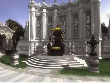 圓明園十二生肖:海晏堂門前左右有弧形疊落式石階數(shù)十級(jí)環(huán)抱樓下噴水池。池東高聳一尊巨形石雕貝殼形蕃花,池左右呈八字形排列著十二生肖人身獸頭青銅雕像。每個(gè)時(shí)辰由相應(yīng)的生肖依次噴水,正午時(shí)分一起噴水, 俗稱水力鐘。