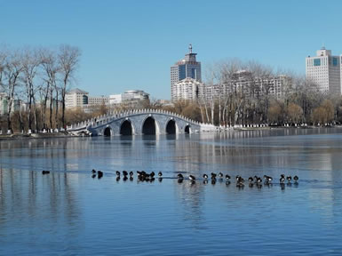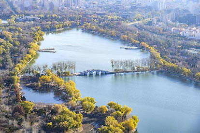 引水湖在公園東北部,有一幽靜湖區(qū),原來為林木囤養(yǎng)區(qū),植被繁茂。隨著公園環(huán)路的建設(shè),這個(gè)占地9.5公頃,地勢(shì)低洼的林區(qū),在1997、1998年被大規(guī);靥罡脑。該景區(qū)的水系是自東湖而來,至釣魚臺(tái)而去。北部地形舒緩開闊,以雪松,銀杏和挺拔的白楊等喬木為主,散布于開闊的草坪,沿公園環(huán)湖路北,配以海棠等春花灌木帶,極具90年代的疏林草地風(fēng)格。