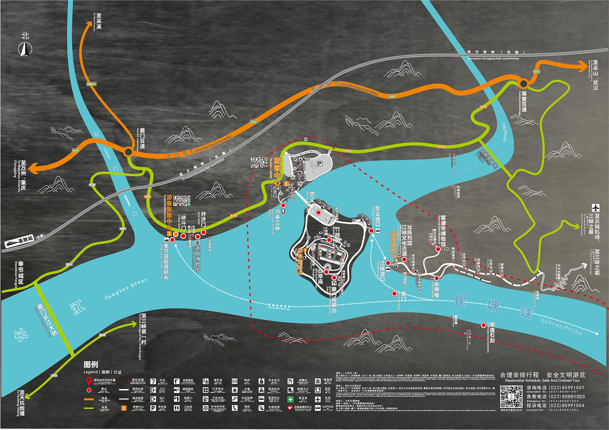 白帝城·瞿塘峽景區(qū)總面積4.7平方千米,主要由白帝城、瞿塘峽兩大景區(qū)構(gòu)成,名勝古跡眾多,融自然與人文、詩情與戰(zhàn)火為一體,是飽覽長江三峽壯麗之美的起點。白帝城擁有多座城門,發(fā)現(xiàn)的有東門、小北門、大北門、皇殿臺甕城門(桑閤門)、小西門、西門等,白帝廟內(nèi)有明良殿、武侯祠、觀星亭等明清建筑。 瞿塘峽緊鄰白帝城,全長8千米,集雄、奇、險、峻為一體,是三峽中最短、最窄、最險的一段峽谷。瞿塘峽內(nèi)北岸赤甲山上有老關(guān)廟文化遺址、大溪文化遺址、巫山猿人遺址三大遺址和老關(guān)廟信號臺、赤甲樓、古炮臺、古棧道、風箱峽懸棺等景點;南岸白鹽山有孟良梯古棧道遺跡、摩崖石刻、犀牛望月峰、猿人峰等景觀,濃縮了中國200萬年的人類發(fā)展史。