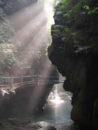其實(shí)藏刀洞乃是一座橫臥于峽中的自生橋。洞口兩側(cè)懸崖峭壁、鬼斧神工,它高50余米、寬處10余米、窄處7—8米、長約45米,地質(zhì)構(gòu)成甚為奇特。該洞是由于億萬年前的地殼運(yùn)動(dòng)形成的溶洞,洞內(nèi)長年在二氧化碳流水的作用下,形成了藏刀洞,用手輕輕一摸,上億年時(shí)光便從指間悄悄滑過。 |