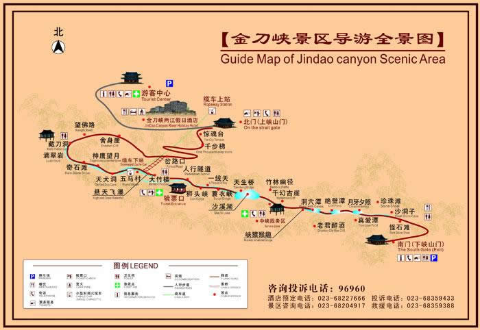 金刀峽地勢(shì)雄偉,以峽著險(xiǎn),以林見秀,以巖稱奇,以水顯幽。金刀峽長約10公里,分上下兩段。上段由于喀斯特地質(zhì)作用,地面切割強(qiáng)烈,金刀神功般形成了獨(dú)特的峽谷幽壑,石壁如削,兩山岈合,垂直高度超過百米,上有古藤倒掛,下有潺潺流水;下段由于流水侵蝕的作用,有洞穴群提高潭潭相連,飛泉瀑布層層疊疊,古鐘乳、石筍、石柱更是千姿百態(tài),堪稱全國最長的峽谷十里仿古木棧道,讓人驚嘆不已。憑棧探幽,可感悟那蘊(yùn)藏于大自然山水的天地靈氣。十公里風(fēng)景線以雄、險(xiǎn)、奇、幽著稱,集瀑、泉、洞、峽于一體。有驚魂臺(tái)、藏刀洞、懸天飛瀑、天犬洞、神鷹峽、獅頭峽、一線天、沙溪湖、中峽天然浴場、千幻古巖、彌樂佛、心形潭等四十多個(gè)景點(diǎn)可供游客探險(xiǎn)、攀登和水上游樂,是人們度假避暑、踏青、回歸自然的旅游佳境,被游客譽(yù)為“夢(mèng)中的香格里拉”、“中國第一險(xiǎn)峽”。
