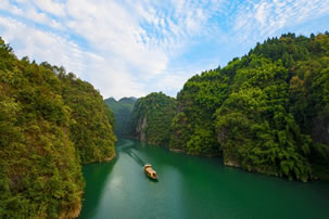 神龜峽位于阿蓬江下游,是國(guó)家4A級(jí)旅游景區(qū),因峽口兩山酷似雌雄雙龜對(duì)臥而得名。兩岸高山絕壁,河道斗折蛇行,形成了天門、巨佛、三郎峰、石壁畫廊、薄刀嶺等奇特景觀,盡顯自然的鬼斧神工。沿途絕壁夾江,全程有27個(gè)彎,有神門、天門、人門等28個(gè)門,其彎道之多,實(shí)屬峽谷罕見。峽谷兩岸茂林修竹,植被原始古樸,生態(tài)優(yōu)美。兩岸不時(shí)有飛瀑奔瀉而下,情趣飄逸。富顯詩(shī)情畫意,是舞文的書齋,揮毫的畫卷,科考的著床。