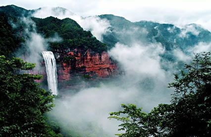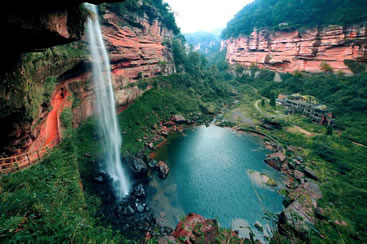 土地巖瀑布在土地巖壁畫對面,如一潔凈的白緞懸垂而下。瀑布高89米,寬25米,懸垂于綠樹紅巖之中,三面赤壁環(huán)繞,與巨幅丹霞赤壁兩相呼應,形成四山鎖絕谷、一水落幽林、綠樹映湖色、丹霞醉畫屏的絕景。