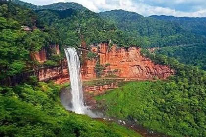 一雄一雌,一南一西,對巖相望,故名鴛鴦瀑布。南瀑高110.82米,為雄瀑,瀑水時而懸垂跌落,時而貼臂滑流;西瀑高90.25米,是雌瀑,瀑水絲絲縷縷,猶如戀人的情絲。雙瀑相望,一路飛珠涌向對方,最后在谷底融為一體,向北而去。