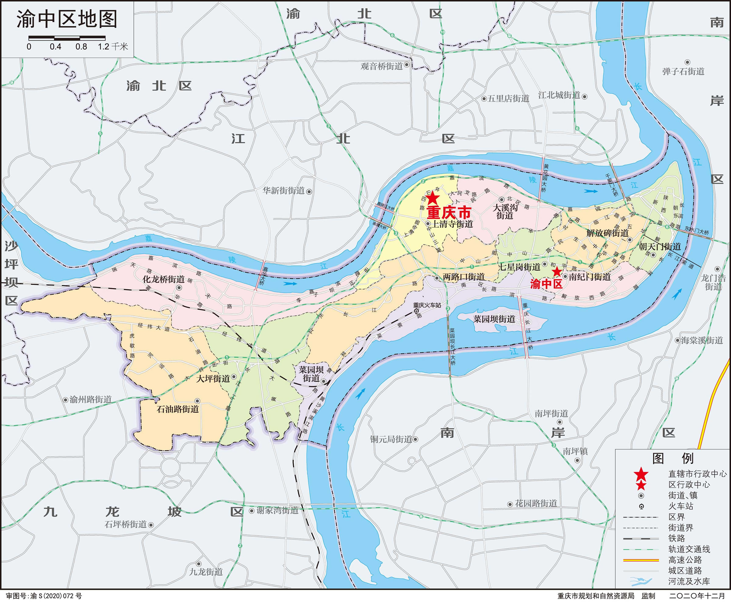 渝中區(qū)轄11個街道:七星崗街道、解放碑街道、兩路口街道、上清寺街道、菜園壩街道、南紀(jì)門街道、朝天門街道、大溪溝街道、大坪街道、化龍橋街道、石油路街道