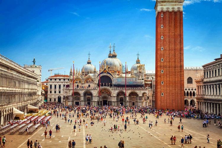 圣馬可廣場 圣馬可廣場(Piazza San Marco) ,官方標(biāo)準(zhǔn)譯名圣馬爾谷廣場,又稱威尼斯中心廣場,一直是威尼斯的政治、宗教和傳統(tǒng)節(jié)日的公共活動中心。圣馬可廣場是由公爵府、圣馬可大教堂、圣馬可鐘樓、新、舊行政官邸大樓、連接兩大樓的拿破侖翼大樓、圣馬可大教堂的四角形鐘樓和圣馬可圖書館等建筑和威尼斯大運(yùn)河所圍成的長方形廣場,長約170米,東邊寬約80米,西側(cè)寬約55米。廣場四周的建筑從中世紀(jì)到文藝復(fù)興時代都有。 圣馬可廣場初建于9世紀(jì),當(dāng)時只是圣馬可大教堂前的一座小廣場。馬可是圣經(jīng)中《馬可福音》的作者,威尼斯人將他奉為守護(hù)神。相傳828年兩個威尼斯商人從埃及亞歷山大將耶穌圣徒馬可的遺骨偷運(yùn)到威尼斯,并在同一年為圣馬可興建教堂,教堂內(nèi)有圣馬可的陵墓,大教堂以圣馬可的名字命名,大教堂前的廣場也因此得名“圣馬可廣場”。