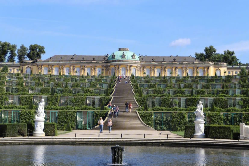 無憂宮 無憂宮(Sanssouci Palace)是18世紀德意志王宮和園林,位于德國波茨坦市北郊,為普魯士國王腓特烈二世模仿法國凡爾賽宮所建。宮名取自法文的“無憂”或“莫愁”。整個王宮及園林面積為90公頃,因建于一個沙丘上,故又稱“沙丘上的宮殿”。無憂宮是18世紀德國建筑藝術的精華,全部建筑工程延續(xù)時間達50年之久。雖經(jīng)戰(zhàn)爭,但從未遭受炮火的轟擊,仍保存十分完好。 宮殿正殿中部為半圓球形頂,兩翼為長條錐脊建筑。殿正中為圓廳。瑰麗的首相廳,天花板上裝潢富有想象力,四壁鑲金,光彩奪目。室內(nèi)多用壁畫和明鏡裝飾,輝煌璀璨。宮殿前有平行的弓形6級臺階 ,兩側(cè)和周圍由翠綠叢林烘托 。宮殿前有噴泉,正對著大殿門廊。此噴泉采用圓形花瓣石雕,四周有“火”、“水”、“土”、“氣”4個圓形花壇陪襯,花壇內(nèi)塑有神像,尤以維納斯像和水星神像造型精美,形象生動。 據(jù)說整個宮內(nèi)有1000多座以希臘神話人物為題材的石刻雕像。宮殿東側(cè)還有珍藏124 幅名畫的畫廊,這些繪畫多為文藝復興時期意大利、荷蘭畫家的名作。畫廊寬敞明亮,每逢佳節(jié),這里都舉辦音樂會;▓@內(nèi)有一座六角涼亭,采用中國傳統(tǒng)的碧綠筒瓦、金黃色柱、傘狀蓋頂、落地圓柱結(jié)構(gòu),被稱為“中國茶亭”。亭內(nèi)桌椅完全仿造東方式樣制造,亭前矗立著中國式香鼎。