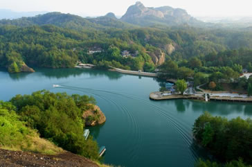 石門湖——坐落于冠豸山東南的石門湖,面積四百多畝,如一塊翡翠,鑲嵌在冠豸山的險(xiǎn)峰奇谷中,四周環(huán)山,“是連城昔日八景之一的"石門宿云"所在地。 要深度感受石門湖的清幽以及風(fēng)景如畫,選擇蕩舟其間,無疑是最好的方式。登上游船,緩緩前行,船漿劃破波光瀲滟的湖面,推動(dòng)著小舟時(shí)而穿過狹窄的峽谷,時(shí)而閑庭信步開闊的湖面,“水轉(zhuǎn)山間走,山回水中行”,山風(fēng)習(xí)習(xí),清涼舒坦。山在慢慢后退,水在慢慢后退,眼看就到湖的盡頭,“山窮水盡疑無路”,卻“柳暗花明又一村”,豁然開朗處曲徑通幽,山環(huán)水繞,水傍山立。
