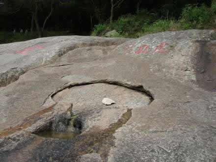 “虎乳泉”旁有“孔泉”石刻。泉眼上下皆石,上石如殼,下石如砥,中坼有孔竅,泉從隙縫里流出,注入一方形石孔中。上有呂道人題刻“虎乳”和宋朱熹撰寫(xiě)的“源頭活水”石刻!盎⑷槿遍L(zhǎng)年不涸,游人耳貼巖石,可聞其巖下傳出“咕咚”的陣陣響聲。
