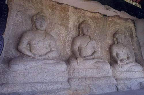 三世佛并排結(jié)咖跌坐于仰覆蓮花座上,主像通高約2.5米,左右二像稍低。佛像保存完好,皆為土蕃式樣:佛發(fā)螺鬢,上置寶嚴(yán)。面相上寬下窄,雙耳垂肩,肩寬腰細(xì),均著袒右肩袈,并以袈裟一角搭于左肩上。衣紋用凸雕線條表示,雖歷經(jīng)滄桑而線條依然明顯。石像均有圓形頭光及身光。中尊釋迦像,為現(xiàn)代佛,主管現(xiàn)代的世界,其造像作觸地印之魔相,一手向下?lián)岬,一手向上。左尊稱(chēng)為藥師佛,即過(guò)去佛,主管過(guò)去的世界。他也是一手向下,一手向上,只是左掌托缽。右尊叫彌陀佛,是未來(lái)佛,作施定印之禪定相,即雙手交疊置于腹部。