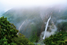 景區(qū)內(nèi)岱仙瀑布總落差約314米,單級(jí)落差184米,雄偉壯觀,被譽(yù)為“華東第一瀑”。晴天,陽光直射,水簾發(fā)光,彩虹若隱若現(xiàn),似巨幅珠簾下垂,像彩綢飛舞,蔚為壯觀。