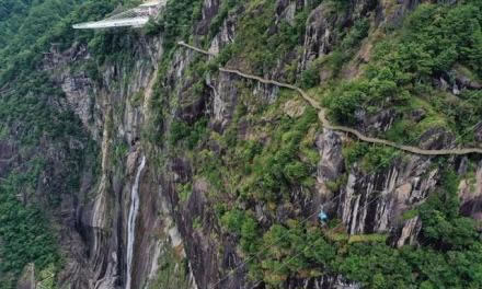 心形懸崖棧道位于岱仙瀑布兩側(cè),從遠(yuǎn)處看,兩邊的棧道整體呈一個(gè)心形,蜿蜒盤桓在崖壁上,心形棧道全程3000米,高差314米,是國內(nèi)難得一見的心形立體環(huán)瀑棧道。