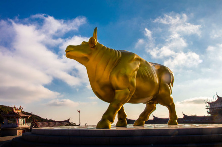 重修的祖殿東側(cè)小山坡上有頭福光萬丈的金牛,游客沿花紋元素登高臺(tái)階可得“福祿壽喜”祝福,金牛底座設(shè)置成轉(zhuǎn)盤,游客可根據(jù)自己的吉時(shí)轉(zhuǎn)動(dòng)牛的方向,再圍繞金牛轉(zhuǎn)行,可完成“牛轉(zhuǎn)乾坤,人轉(zhuǎn)錢來”的祈福體驗(yàn)。