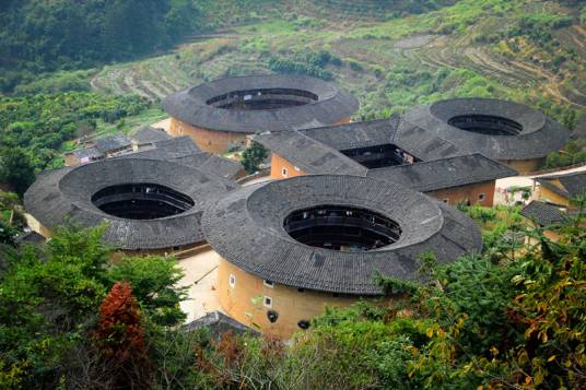福建土樓產(chǎn)生于宋元,成熟于明末、清代和民國(guó)時(shí)期。土樓以石為基,以生土為主要原料,分層交錯(cuò)夯筑,配上竹木作墻骨牽拉,丁字交叉處則用木定型錨固。福建土樓或方或圓,以圓為主,如珍珠般灑落在閩西南的綠水青山間。福建土樓遵循了“天人合一”的東方哲學(xué)理念,就地取材,選址或依山就勢(shì)、或沿循溪流,建筑風(fēng)格古樸粗獷,形式優(yōu)美奇特,尺度適當(dāng),功能齊全實(shí)用,與青山、綠水、田園風(fēng)光相得益彰,組成了適宜的人居環(huán)境以及人與自然和諧統(tǒng)一的景觀。