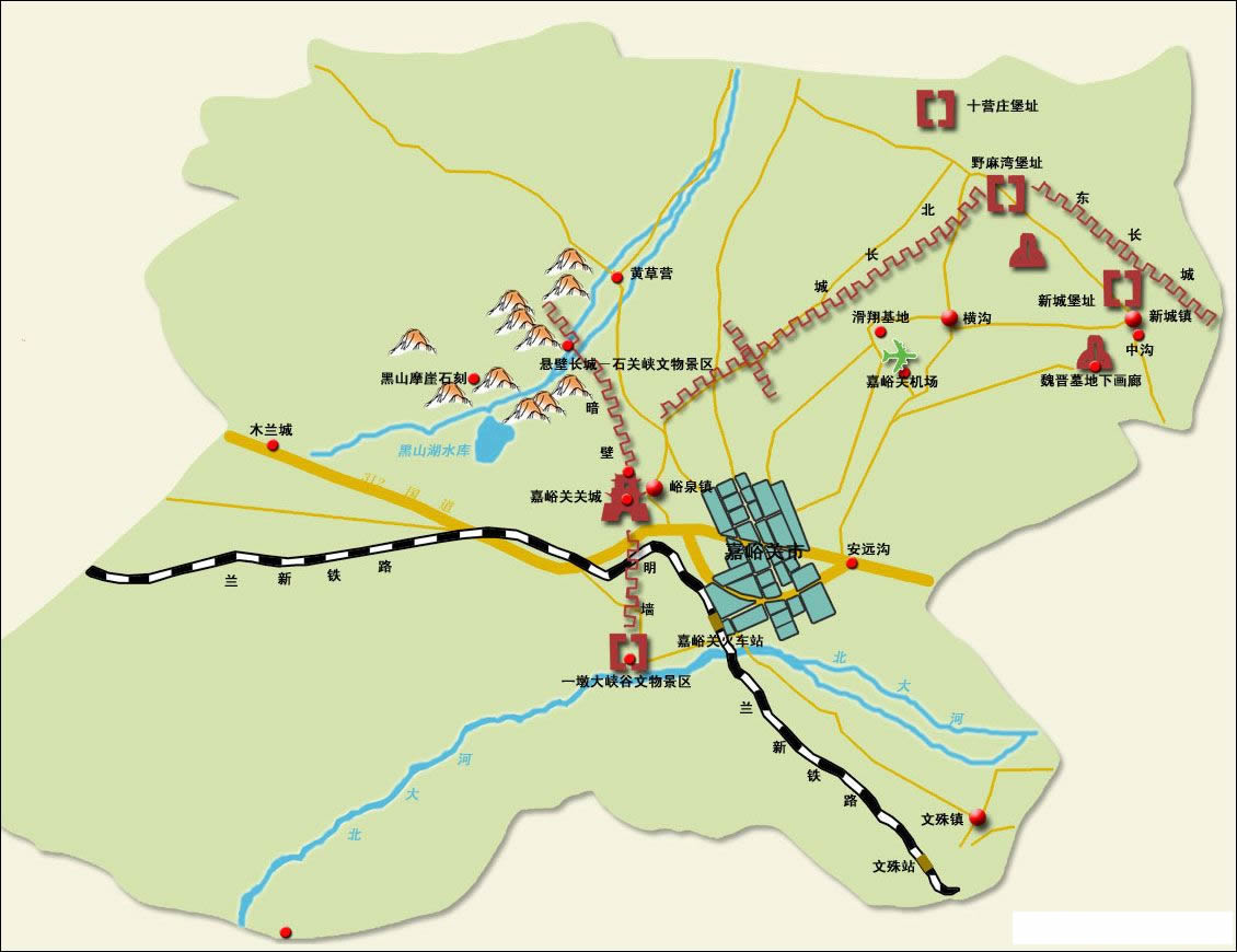 主要景點:嘉峪關關城、長城第一墩 、懸壁長城 、七一冰川 、魏晉壁畫墓 、滑翔基地 、長城博物館 、黑山摩崖石刻 、雄關廣場