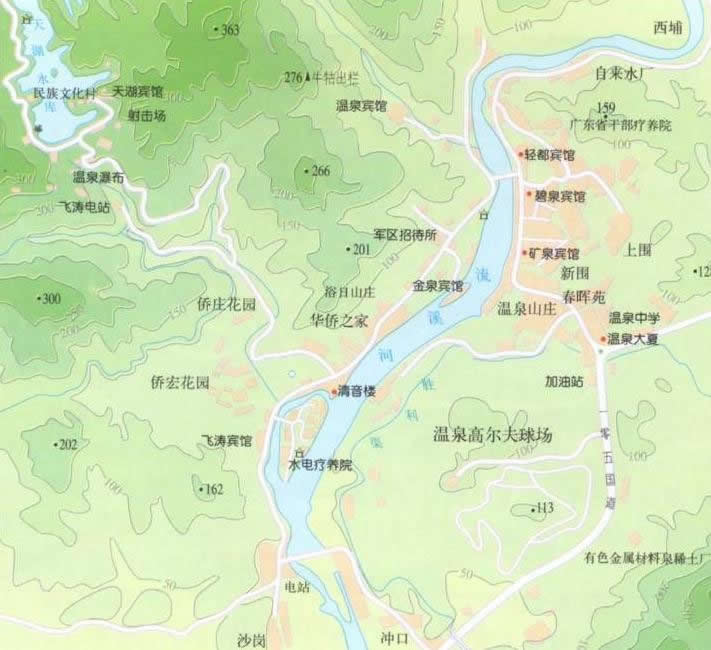 泉區(qū)共有泉眼13處,分布在河?xùn)|、河西兩岸。泉水含有多種化學(xué)成份,溫度最高可達73℃,最低的也有30℃。在此洗浴,可以有效地消除身體的疲乏,調(diào)節(jié)各器官的功能,多次沐浴能達到祛病強身的目的。壯麗的碧浪橋橫跨流溪河,將兩岸連為一體。河?xùn)|岸是溫泉療養(yǎng)區(qū),河西岸是旅游賓館別墅區(qū)。