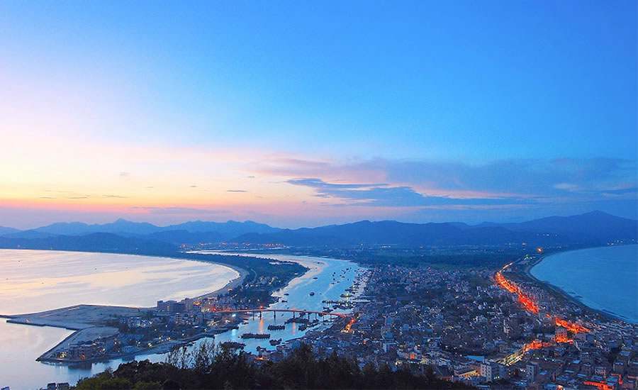 雙月灣位于惠東縣港口濱海旅游度假區(qū),地處惠東縣稔平半島的南端,三面環(huán)海,因形狀鳥瞰似兩輪新月,故名“雙月灣”。雙月灣共分兩灣,由大亞灣和虹海灣相鄰的兩個半月形組成。左灣水平如鏡,右灣波濤洶涌,兩條沙垅直奔大星山,如蛟龍出海,似雙龍戲珠,有靜有動,十分壯麗。