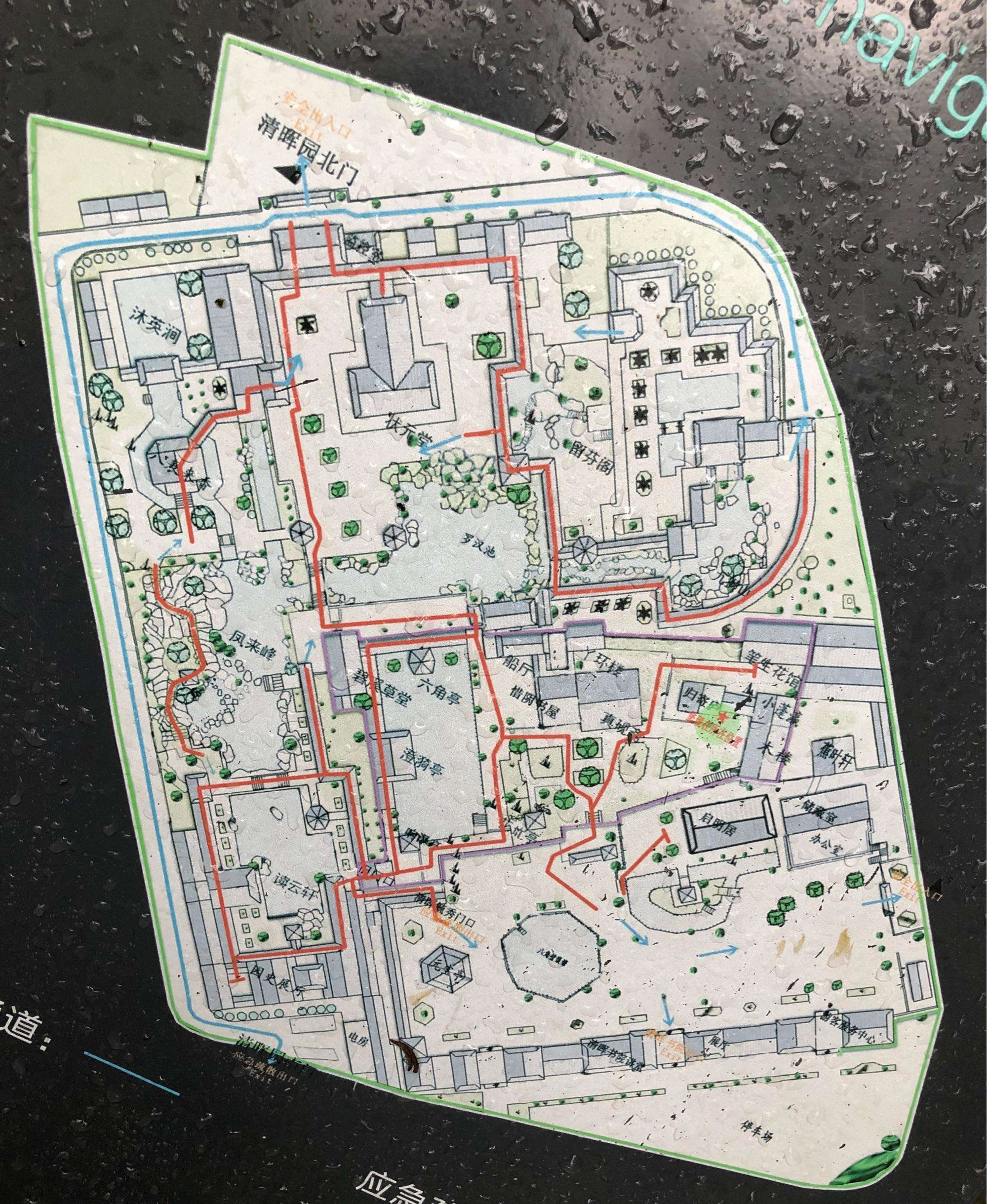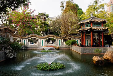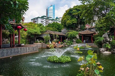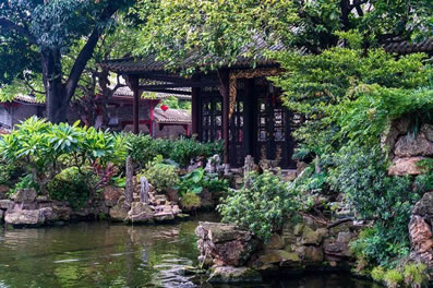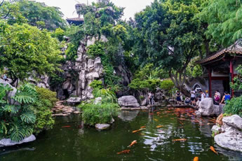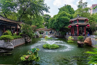 在花木配置方面,園內(nèi)花卉果木逾百種,除了嶺南園林常用的果樹,還栽種了蘇杭園林特有的紫竹、枸骨、紫藤、五針?biāo)伞⒔疱X松、七瓜楓、羽毛楓等,并從山東等地搜集了龍順棗、龍瓜槐等北京樹種,其中銀杏、沙柳、紫藤、龍眼、水松等古木樹齡已百年有余。