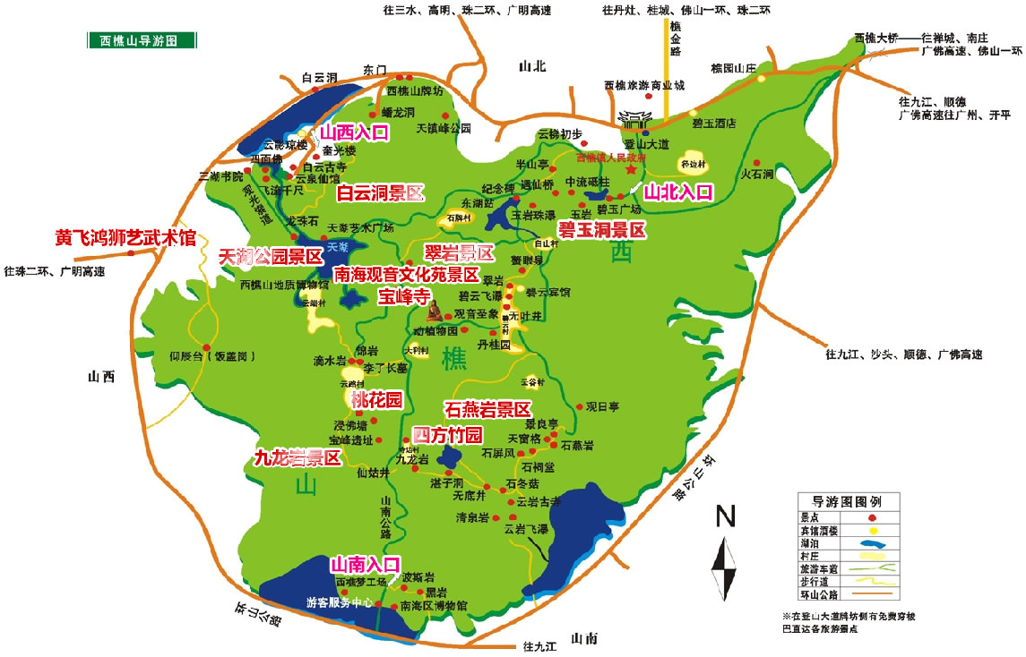 西樵山是一座沉寂了億萬年的死火山,自然風光美不勝收,山上有72奇峰和36奇洞及大大小小的湖泊、泉瀑和深潭;由于西樵山林深苔厚,儲存了極為豐富的水資源,因而被稱為“固體水庫”。整個包括石燕巖、 作為“珠江文明燈塔”的西樵山有著6000多年的文明史,古西樵山人創(chuàng)造了燦爛的“雙肩石器”文明;到明清期間,有大批的文人學子曾隱居在這里,使西樵山獲得了“南粵理學名山”的雅號;西樵山還是“南拳文化”的發(fā)源地,一代宗師黃飛鴻就出生在這里;西樵山民風淳樸、古韻猶存,到這里來旅游,還能觀賞到山里百姓的婚嫁、生產習俗以及各種民間游藝活動。
