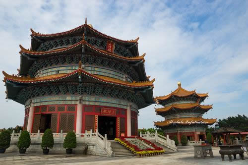 三清殿東南邊這座三層綠色琉璃蓋頂的半仿古大樓,稱太和樓,二樓大廳是中華民族館,反映中國56個民族的居住地,民俗和穿戴的服飾。三樓大廳是雅石館,館內集天下之奇石。所謂奇石,就是自然生成形狀奇怪的石頭,例如其中一塊菊花石,就是花都區(qū)花山鎮(zhèn)的特產。這石頭無論敲成多少塊,滿身都是菊花形狀,白色半透明;ǘ紖^(qū)區(qū)花是菊花,是源于特產菊花石寓意。山門、山門牌坊門、廣場(兩側為鐘樓、鼓樓,各立一華表)、三清大殿(采用傳統(tǒng)的天壇形式建造,殿頂的巨大圓球以純金制成)為觀的中軸建筑。該觀整體建筑以仿古“天壇”形式建造,氣派莊嚴,四周環(huán)境雅致,素有廣東“小天壇”之稱。 |