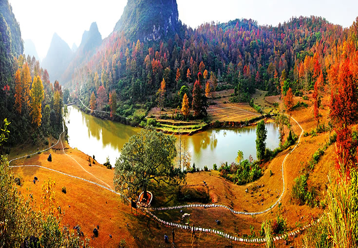 紅葉森林公園位于德?h東北側(cè)方向,國家AAAA級旅游景區(qū)暨自治區(qū)級森林公園,距縣城3.5公里,交通便利。公園規(guī)劃面積1036.5公頃,該公園核心景區(qū)為紅楓湖游覽區(qū)和紅葉谷游覽區(qū),以紅楓為主題。金秋時節(jié),楓葉似火,湖水輕柔,互襯互耀,頗具詩情畫意。公園的紅葉品種主要以楓香為主,葉子顏色分別有深紅、絳紅、霞紅、黃紅混合等,觀賞時間較長,有著“德保楓葉賽九寨”的美譽(yù),是秋季里一道亮麗的風(fēng)景線。公園以紅楓湖、紅葉谷一帶的紅楓林為依托,襯托著多姿多彩的紅葉森林景觀、森林生態(tài)景觀、底蘊(yùn)深厚的人文景觀和綺麗迷人的水文景觀,將紅楓湖、上章湖、紅葉谷構(gòu)成休閑避暑游覽的大旅游圈,景區(qū)內(nèi)上章水庫和百布水庫交相輝映,總庫容量分別為365萬立方米和190萬立方米;有效灌溉面積分別為2200畝和2000畝。目前,景區(qū)各項(xiàng)基礎(chǔ)設(shè)施正在逐步完善。德保境內(nèi)有10萬多畝連片的紅楓林,遍布城關(guān)、那甲、馬隘、巴頭等鄉(xiāng)鎮(zhèn)。除紅葉森林公園外,馬隘至巴頭一線還有許多別具特色的賞楓景點(diǎn),無一不令人流連忘返。