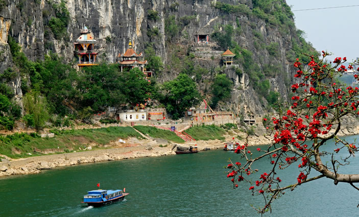 金雞巖位于縣城西北隅,坐落在架山腰間,瀕臨左江,與扶綏中學(xué)隔江相望。 [22]主洞面積40多平方米,高4米、內(nèi)設(shè)有金雞娘娘、斑民夫人、花公、花婆、花木蘭等塑像。洞口左側(cè)有伏波亭,右側(cè)有伏波將軍塑像。沿江岸有103級(jí)石階通往洞口。金雞巖為明代遺址。相傳金雞娘娘于此修道成正果,故名“金雞巖”。明代著名地理學(xué)家、旅行家徐霞客留下“三誤三返”游跡;清代名人劉宅俊在懸崖巖壁上刻鐫著“雞巖帆影”題詞;道光癸卯年記載著李佑會(huì)題刻銘詩。
