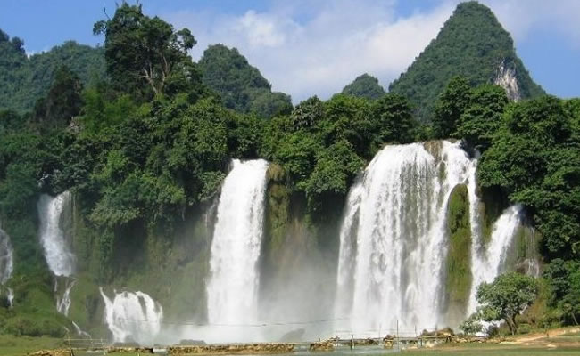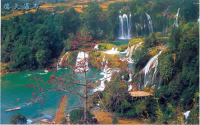 德天瀑布雄奇瑰麗,變幻多姿,碧水長(zhǎng)流,永不涸歇。瀑布四季景色不同,春天凌草泛青,山花吐艷,瀑布四周被鑲起五彩繽紛的花邊;秋天梯田鋪金,層林盡染,高掛的銀簾霧氣沖天;冬天瓊珠閃閃,玉液潺瀑,山風(fēng)把細(xì)流吹得飄飄灑灑;夏天激流如