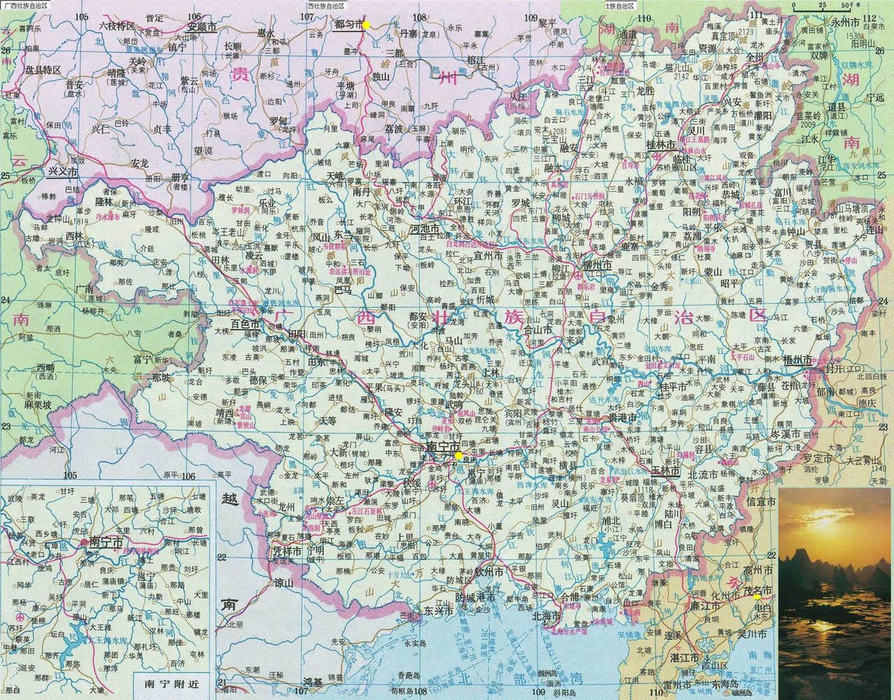 廣西河流眾多,清澈娟秀,在地域上多與奇峰相配,形成一派山環(huán)水繞,山水相依的秀麗景色。除舉世聞名的漓江外,景色優(yōu)美的還有融水的貝江、資源的資江、宜山的下規(guī)河、大新的黑水河、崇左的左江、寧明的明江等。湖泊風(fēng)景多以較大的湖泊或水面為主景,湖岸的山丘、原野和農(nóng)家村舍、田園風(fēng)光或城市風(fēng)貌等為襯景而組成。如桂林的榕湖、杉湖,南寧的南湖,柳州的龍?zhí),貴港的東湖,陸川的龍珠湖等。此外,廣西還有不少水質(zhì)優(yōu)良、水面寬闊、群山環(huán)抱、湖光山色十分秀美的水庫(kù),如靈川青獅潭、百色澄碧河、富川龜石、邕寧大王灘、合浦洪湖江、玉林寒山等水庫(kù)。