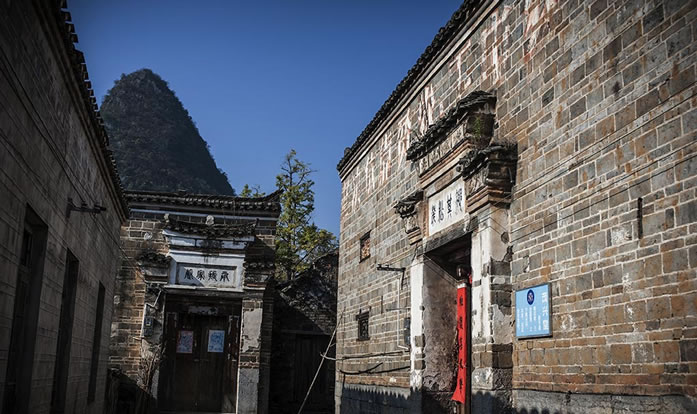 在明洪武年間,山東一位被貶的秦姓官員千里跋涉來到桂北地區(qū),據(jù)村民說,他們是唐代名將秦瓊的后人。后來秦氏的一支看中了水源頭村自周的山形地勢,于是選取了這個“風水寶地”落下根基。經過多年繁衍,漸成規(guī)模。在后籠山下,依山勢拾級而建成了成片的大宅子,當?shù)厝朔Q其為“秦家大院”。這些宅子基本為三進三開,房屋分為四組,組與組間隔兩米,形成狹長的巷道,均以青石板鋪筑。宅子的高堂、戲院、花廳都敞開大門,兩旁房子的大門朝里開,很有意思。宅子的墻壁都以幾噸重的青石方墩為基,砌上1米多后,改用青磚砌至屋頂,很獨特。高大敞亮的上層樓房,窗戶上鑲嵌的窗花是琉璃瓦燒制而成,上面還畫著花卉,溫婉中透著古色古香。房中的板壁上刻著各種花紋的圖案,庭柱下的石礅上鑿有龍鳳的花飾,精細美觀。
