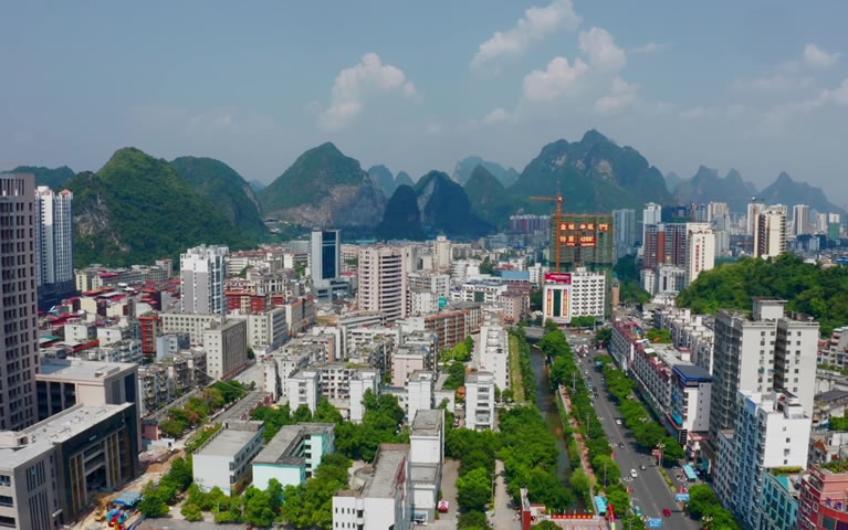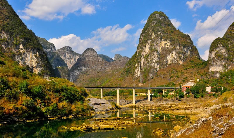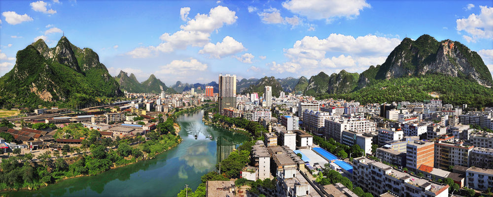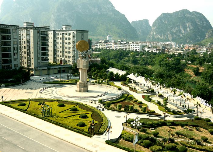地形 金城江區(qū)系云貴高原余脈地帶,地勢自西北向東南傾斜,一般海拔為400-600米,最高海拔為1114米。屬桂西北邊陲要地,全境東西長68千米,南北寬62千米,總面積2340平方千米,耕地面積23.5萬畝。