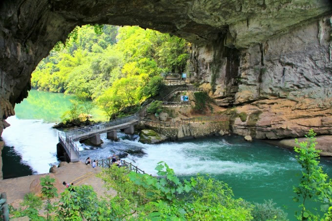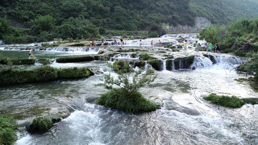 響水瀑布洛江灘頭,河水奔流而下,其聲隆隆,遠聞若雷,近聞似鼓,四季如此,故此得名“響水”。此響水灘為典型的喀斯特地貌,水流呈階梯狀分布,在地質學上稱為邊石壩,所含成份多為鈣化石?膳c九寨溝五彩池比美。