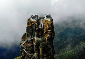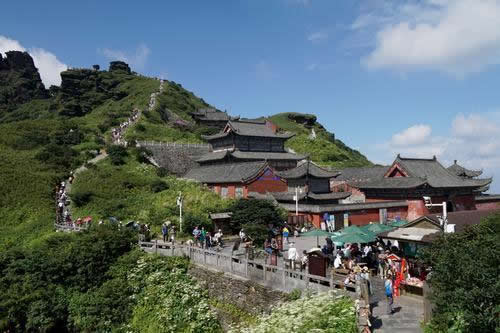老金頂海拔2493米,是梵凈山第二高峰。因月光下石壁經(jīng)常出現(xiàn)彌勒佛為眾生說法的圖像,又名“月鏡山”。老金頂上建有燃燈殿,供奉燃燈古佛。燃燈古佛屬過去佛之一,此佛初生之日,四方皆明,日月火珠復(fù)不為用。