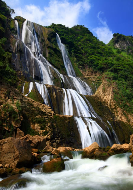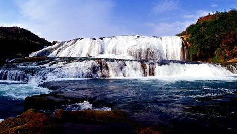 “遙聞水聲轟轟,從隴隙北望,忽有水自東北山腋瀉崖而下,搗入重淵,但見其上橫白闊數(shù)丈,翻空涌雪,而不見其下截,蓋為對(duì)崖所隔也!边@是徐霞客在《徐霞客游記》中對(duì)陡坡塘瀑布的描述。陡坡塘瀑布因1985年曾在該瀑布拍攝電視連續(xù)劇《西游記》序曲《敢問路在何方》中,唐僧師徒四人牽馬過河的場(chǎng)景而聲名遠(yuǎn)播。