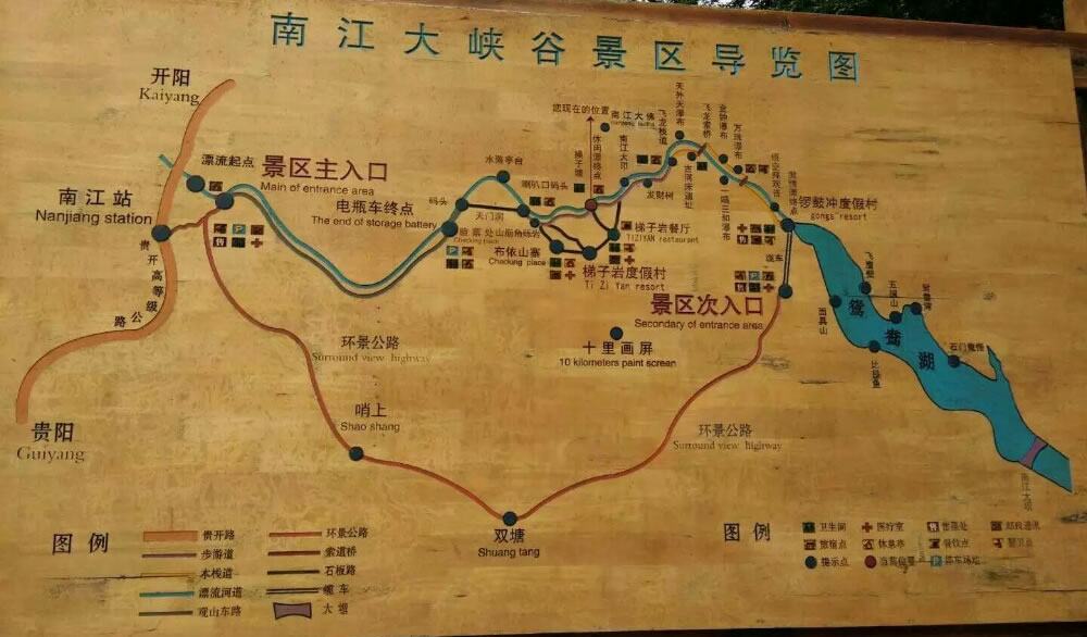 先乘坐火車到貴陽,在貴陽市內(nèi)的第一客運站有開往開陽的班車,86公里的路,車行2小時。票價20元。20分中一班車很方便。去南江大峽谷,可在開陽縣城里坐客運班車前往,早班車8點30分,車行一個半小時,到景區(qū)大門,進大門后尚有3公里路需要坐摩托車到峽谷碼頭,每人5元。當然你也可以步行。景區(qū)內(nèi)可漂流(在漂流區(qū)段內(nèi)),也可步行,步行路大都是棧道狀,整個景區(qū)十幾公里的路,五、六個小時就可輕松自在的游完全程。