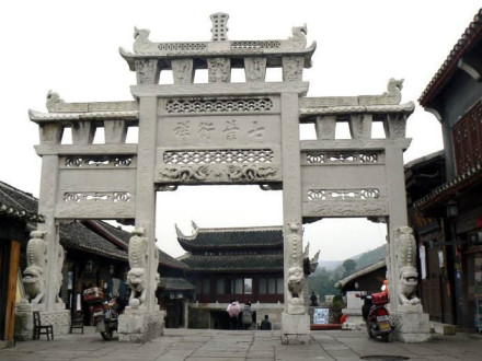 青巖古鎮(zhèn)城中原有八座牌坊橫跨在石板鋪筑的大街上,如今尚存兩座百歲坊和一座貞節(jié)牌坊。定廣門內的趙理倫百歲坊,是清道光二十三年(1843年)奉旨建造的。它是一座四柱三間、三樓四阿頂的石牌坊,高9.5米,寬約9米。精心雕琢的石牌坊,在藍天白云之中,顯得空靈。正中的橫額上,鐫刻著道光皇帝的題額,正面是“七葉衍祥”,背面是“升平人瑞”,上端有“欽賜”二字。抱柱的四對石獅子非同尋常,不是站獅,也不是臥獅或蹲獅。八頭獅子仿佛是從高山上俯沖下來,富有靈性。