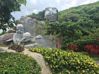 鑒真(公元688—763),揚(yáng)州人,本姓淳于,唐代高僧。唐天寶元年(公元742)應(yīng)日本天皇之請赴日本傳經(jīng),六次渡海,前五次失敗。天寶七年(公元748年)六月,鑒真師徒等35人,從揚(yáng)州啟程第五次渡海時(shí)遇颶風(fēng),漂流萬里到振州(三亞市)寧遠(yuǎn)河口(今大小洞天風(fēng)景區(qū))一帶登岸。在振州居住一年,修造大云寺,傳播佛教文化。鑒真赴日本弘法的決心不變,終于在天寶十二年(公元753)六次東渡成功。在日本十年,為促進(jìn)中日兩國文化交流,發(fā)展兩國人民之間的友誼作出了杰出的貢獻(xiàn),為紀(jì)念這一歷史壯舉,特興建此巨型群雕。