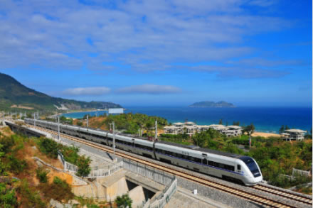 環(huán)島鐵路:海南環(huán)島鐵路由海南東環(huán)鐵路和海南西環(huán)鐵路組成,連接?谥寥齺,東環(huán)308千米,西環(huán)345千米,主要運(yùn)行動車組,是全球首條環(huán)島高鐵。它的建成,將有利于優(yōu)化產(chǎn)業(yè)布局,帶動縣域經(jīng)濟(jì)協(xié)調(diào)發(fā)展;高鐵牽引動力為電力,沒有廢氣排放,能源消費(fèi)量低,對海南建設(shè)生態(tài)省和節(jié)約型社會將發(fā)揮積極作用;大大完善海南旅游基礎(chǔ)設(shè)施,滿足海南國際旅游島不斷增長的運(yùn)輸需求,為海南建成世界級海島休閑度假旅游勝地提供有力支撐。