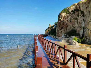 望海長廊,距鷹角亭50米,廊長70米。游人逗留廊中,遠眺渤海碧波,白云沙鷗,帆船巨艦;近賞淺水明澈,微波清蕩,看拾貝之人歡笑,聽大海之波濤,令人流連忘返。海邊建“浴日亭”,其匾額為嚴濟慈先生所寫。廊中彩繪雕梁畫柱,栩栩如生。兩側(cè)是由方亭和八角亭組成,分別采用了古代園林常見構(gòu)景手段—借景和透景的方法,吸收了北京頤和園和承德外八廟長廊的特點,繪畫了北戴河24景和北戴河206個民間故事傳說,以花鳥、魚蟲、人物等不同圖案,這種彩繪叫做“蘇式彩繪”。高于蘇式彩繪的要屬“旋子彩繪”畫面用簡化式的渦卷瓣旋花,有時也可以畫龍鳳,一般用于次要宮殿式寺廟中。等級最高的彩繪要屬“和璽彩繪”。中間的畫面由不同的龍或鳳的圖案組成,間補以花卉圖案,金碧輝煌,十分壯麗。 |